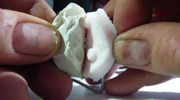 3. Pele la arcilla de la silicona. El sprue, si era una parte de esta mitad del molde y la pieza quedará en la parte de silicona del molde. El alambre debe salir. Puede pasarlo hacia atrás a través de la silicona o cortar la silicona alrededor del alambre.