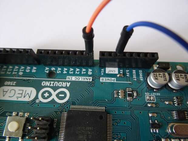 1. Conecte el segundo cable al pin de Arduino analógico 0 (en el Arduino UNO analógico 0 y Digital 14 son el mismo pin) (foto 3)