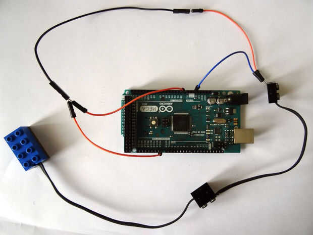 Se puede ver conectado el Arduino MEGA (cuadro 4). En mi caso usé un LEGO de alambre por lo que yo puedo experimentar fácilmente con diferentes sensores de repuesto. Esto no es necesario para este proyecto, por lo que puede conectar directamente al sensor sin cable adicional.
