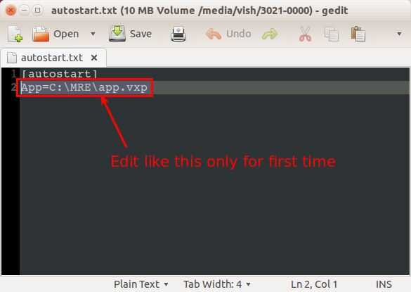 - En la raíz de LinkIt una unidad, se puede ver 'autostart.txt'. Cambiar la segunda línea aApp=C:\MRE\app.vxp