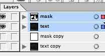 De caja de la capa menú desplegable crear una nueva capa y anule la selección de todas las vistas de capa excepto esta nueva capa en blanco. Con la herramienta texto, insertar tu texto y ajustar para el apresto. Debe tener su cama de texto presentado de la forma que desee. Ahora duplicar esta capa de texto, llamar a la capa original del texto y el texto duplicado, o algo apropiado. Seleccione los puntos de vista de la capa de la máscara y la capa de texto con máscara están en la parte superior. Pulse la tecla Mayús para que ambas capas se destacan así (ver la imagen en este paso). Ahora hacer un Select All, y usted debería ver la cama de texto y la silueta que se destaca.
