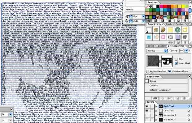 Seleccionar sólo los puntos de vista para las capas de texto de luz y oscuro. Debe superponer perfectamente. Zoom y verlo donde el texto pasa de oscuro a la luz. ¿Bastante limpio, eh? Para limpiar, pulse la tecla Mayús dos capas en el cuadro de capas y seleccione combinar seleccionadas en el menú desplegable para crear la capa final. Puede eliminar todo el resto de las capas ahora si desea, o la selección de sus puntos de vista. Recuerde que en este ejemplo he utilizado muchas escalas más pequeñas para simplificar. En un diseño real esto se vería mucho mejor con el texto completo e imágenes de tamaño completo.