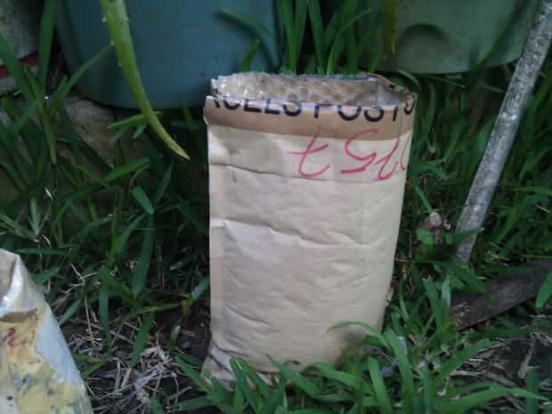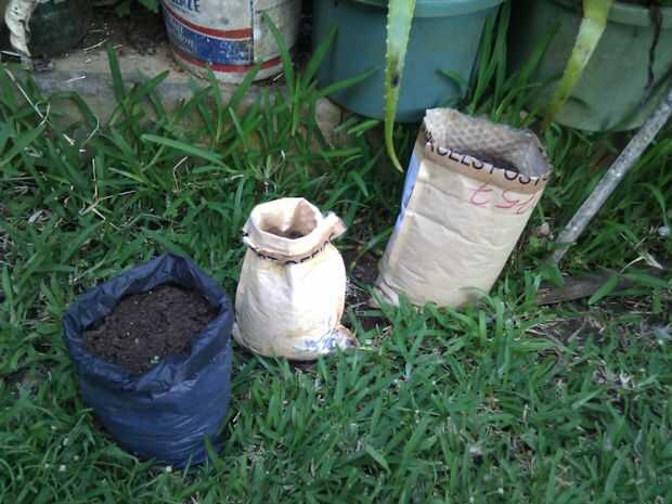 Me pareció difícil hacer los agujeros cuando los paquetes estaban vacíos, así que lo que he hecho fue llenar la bolsa con el suelo primero y hacer la parte inferior del paquete de planos en el suelo para que puede valerse por sí mismo por seguir a llenar la bolsa y entonces a través con el clavo 2 los agujeros de perforación en cada lados.