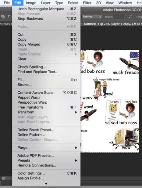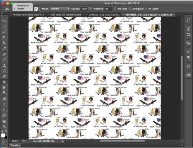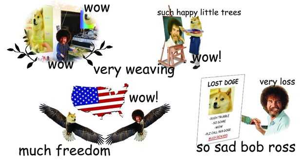 El primer paso en el diseño de un textil para tejer debe dibujar algo en Photoshop. En este caso, yo quería hacer algo que se asemejaba a una toile. Quisiera patrones toile porque muestran escenas históricas en hermosa repite monótona. Normalmente se imprimen textiles toile, pero quería a mi patrón de tejido directamente en la tela. En lugar de utilizar imágenes de siglos pasados, decidió hacer un toile de cultura internet usando principalmente imágenes de Dogo y Bob Ross. Una escena muestra a Bob Ross y Dogo como las cabezas de águilas con América en el fondo, otra es de Bob Ross pintando un signo perdido Dogo, en otro un doge humanoide es pintar un retrato de Bob Ross y finalmente una imagen de Lia Cook (quien fue pionero en el uso del telar de Jacquard en el arte) ha sido alterada por lo Bob Ross en su estudio que teje una imagen del Dogo.