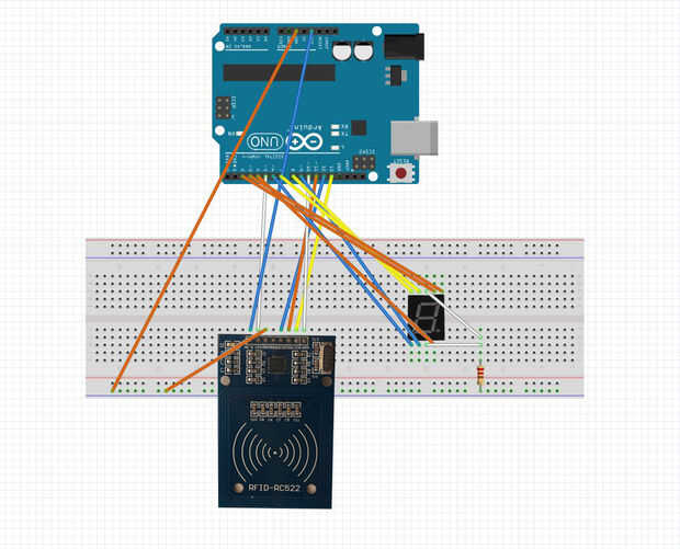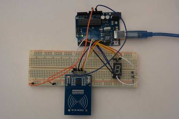 La tarjeta de identificación puede utilizarse ahora para identificar a los usuarios y mostrar un mensaje personal. Para los propósitos de la demostración nos fuimos con algo simple: la identificación de sí mismo. Ahora es tiempo de conectar la pantalla de 7segmentos. Se puede ver un diagrama de cableado en las fotos adjuntadas. Antes de usted todo con alambre, puede probar cada segmento por separado. Primero conectar los cátodos mediados (tanto superior e inferior) a la tierra, a través de una resistencia de 220 Ohm. Agarra un cable Conecte el pin de 5V de arduino y conectar brevemente a cada segmento. Cada vez que el segmento correspondiente deberá encenderse. Es más fácil (código de sabio) a segmentos de alambre A F en la pantalla (ver imagen) para pernos de 2 a 8 en el arduino respectivamente (no necesita el segmento de punto), pero puesto que el pin 5 es tomada ya por el escudo, haremos una excepción y alambre al pin 9 en su lugar. Esto es importante ya que específicamente se tiene que codificarse en así.
