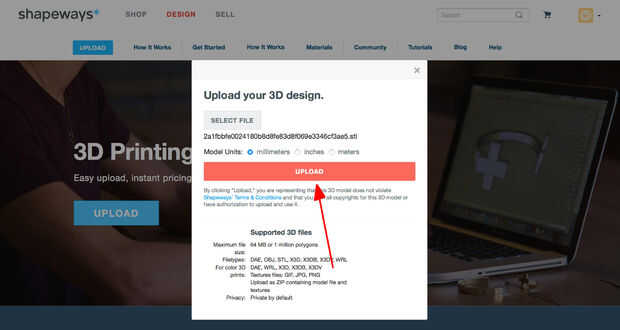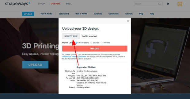 Vamos a empezar con 'Diseño' como tenemos que subir primero un modelo. A continuación, haga clic en cargar. Un cuadro será emergente con un enlace para seleccionar un archivo. Haga clic en ese enlace y seleccione el archivo STL de anillo que descargaste en el primer paso. Asegúrese de que milímetros son revisados por las unidades del modelo y luego haga clic en cargar.