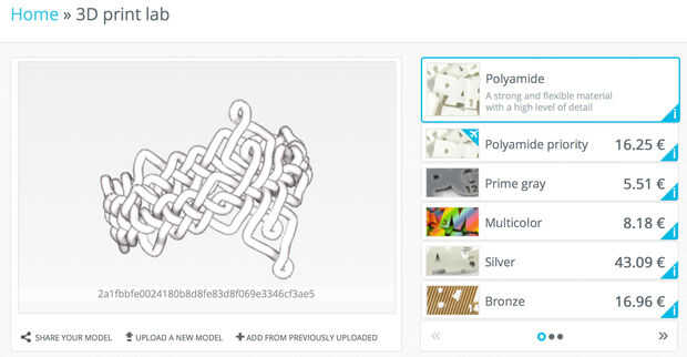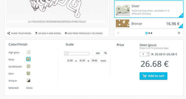 Después se ha subido el modelo, precios se calcula y aparece junto a su modelo. Haga clic en un material a la derecha Mostrar terminará opciones abajo, que también afectan el precio. Por ejemplo, selección de plata como se muestra en la foto de arriba, demuestra 5 terminará opciones. Selección del brillo es aproximadamente como el material de plata pulida de Shapeways, que con el Euro está bastante cerca el dólar ahora está en el puesto justo debajo de $30, que está a menos de Shapeways. Sin embargo, con el coste de envío adicional a los Estados Unidos, es comparable. Entonces puede pulsar añadir al carro y pago con tarjeta de crédito o Pay Pal.