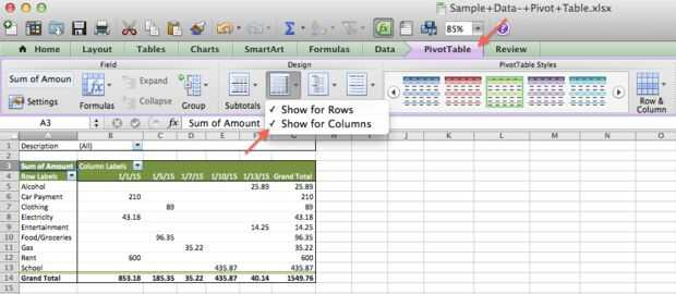 Actualmente, la tabla dinámica muestra un "Gran Total" de la fila y columna. Quitando esto permite un uso más eficaz del próximo paso. Para eliminar el "gran Total" de la tabla dinámica:
