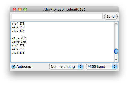Quería a cero este código como lo hice con el anterior código de acelerómetro. Yo estaba esperando los resultados de x e y giro para igualar la salida de Vref mientras el dispositivo se mantiene inmóvil, pero como se aprecia en la figura 6, esto no es el caso (si alguien tiene una explicación para esto me encantaría oírla!). Puesto que Vref no era una referencia de Dios para mí a cero mi salida, usé algunos valores preestablecidos basados en los datos de la figura 6, puede encontrarlos en mi impresión declaraciones en el código siguiente. También quité el monitoreo de Vref, puesto que parecía ser estable sin importar cuánto me mudé el dispositivo, esto también me salvó un pin de entrada analógico en el Arduino.