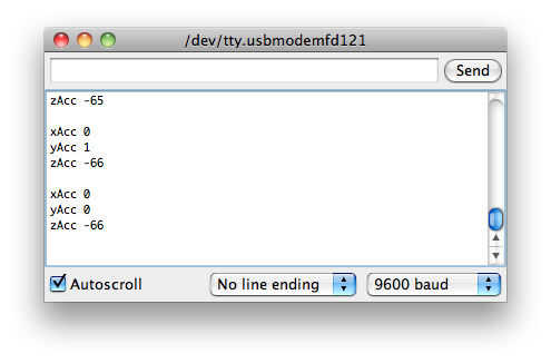 El código siguiente muestra la aceleración X, Y y Z para la placa en el serial monitor (ctrl o Comando + Mayús + M). He intentado centrar los valores alrededor de un punto cero introduciendo la variable "cero" en mi código y luego restando todos mis datos entrantes de este número. De esta manera cuando la Junta se celebra paralela a la tierra, la aceleración X y Y ambos Lee 0. Cuando la Junta se inclina x positivo mostrará un número positivo, y cuando se inclina para X negativo se mostrará un número negativo (lo mismo va para Y). Este código de acelerómetro le permite determinar la orientación de la placa en el espacio 3D.