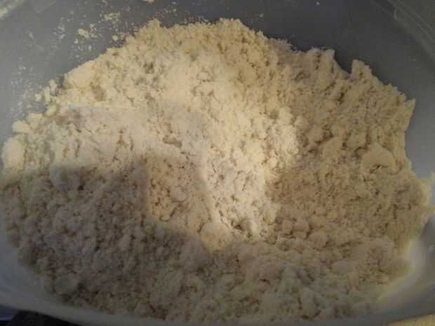 Poner sus procesador de alimentos la tapa y empezar a pulsar el procesador de alimentos hasta obtener textura de miga, esto permite saber que la manteca ha sido incorperated lo suficientemente bien.
