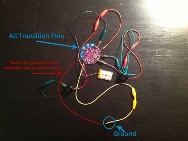 Siguiente al interruptor. Debería ver una luz roja cuando el interruptor está encendido. Tomar la pinza de tierra ajena y tocarlo (no acórtelo en) el número de disparo (transición llamado pins en la foto) que la canción es a. Por ejemplo si usted llama su 1firstsong.mp3 canción entonces debe tocar el suelo para placa T1. Después de un par de segundos levantar fuera de la placa de gatillo. El MP3 debe empezar a jugar.