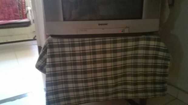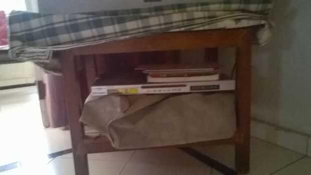 Así que tenemos esta mesa extra que usamos para mantener nuestra televisión en. Es un doble nivel para que el reproductor de DVD y libros están en el nivel inferior y su fácilmente cubierto con un mantel. ¡ Y listo!