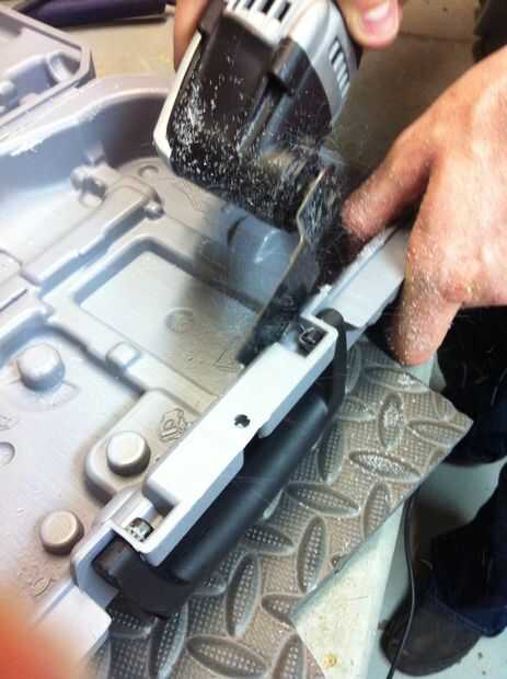 Instalar la hoja de Sierra pequeña en el Multi Max y comenzó a cortar a través de la capa de plástico que la parte interior de la caja a la parte exterior de la caja. El Multi Max cortar fácilmente a través de la plástica a mano alzada, con poca orientación.
