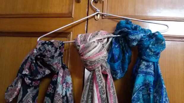 Reducir también el espacio se ocupa por los numerosos pañuelos y silenciadores en su wadrobe atando a todos ellos juntos en una sola percha.