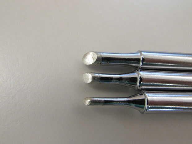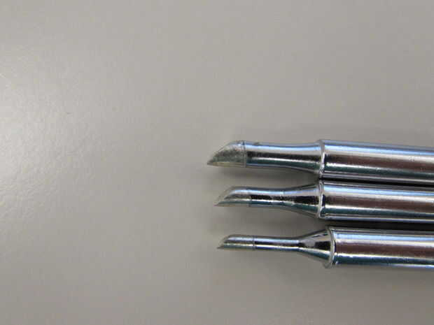 A pesar de mirar como accidentalmente fueron molidas a un lado, estos tips son bastante útiles, sobre todo en la serie C arrastre de soldadura. El rostro ligeramente curvo es ideal para separarse hacia fuera de la soldadura sobre la punta y luego aplicar uniformemente pequeñas cantidades de la soldadura sobre varios componentes en proximidad cercana (como los pines de un componente de montaje superficial).
