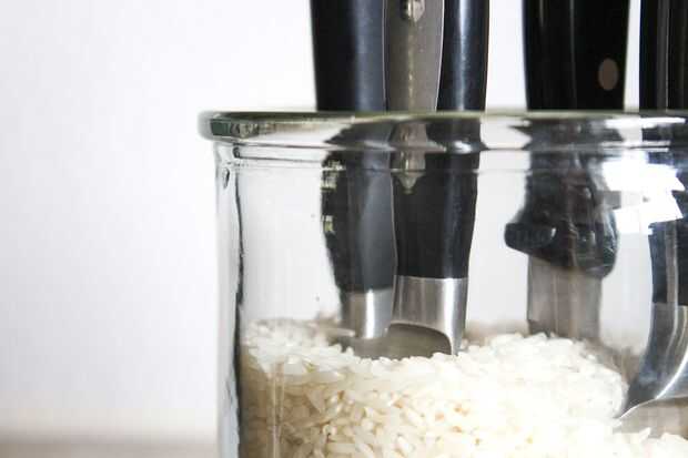 La una advertencia aquí es tener cuidado al poner los cuchillos en el arroz - no hay mucho que evitar chocar con el fondo del recipiente - por lo que puede opacar las puntas si no eres cuidadoso.