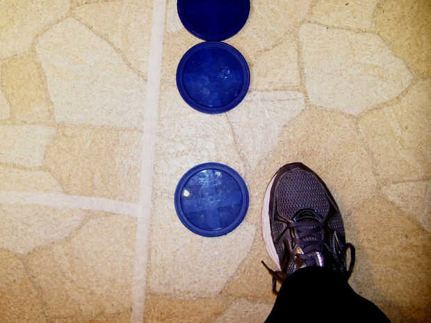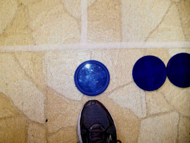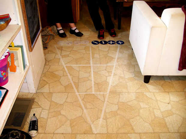 Crear tu propia página corte Shuffle Board en cualquier superficie lisa dura. Este juego de Shuffle Board fortalecerá el "pie" coordinación de ojo así como el equilibrio.