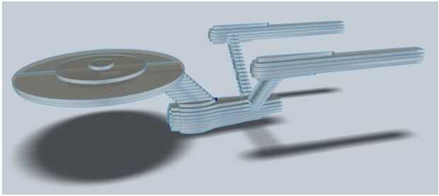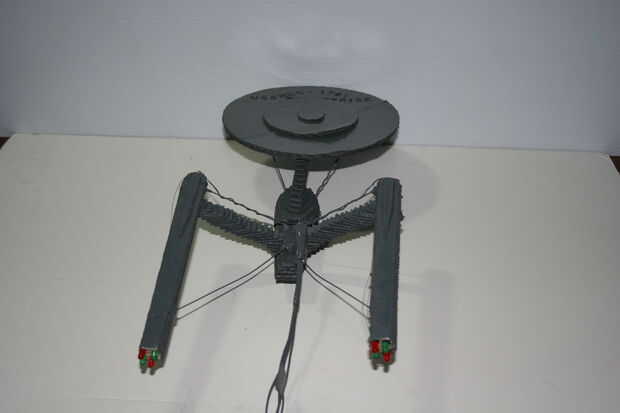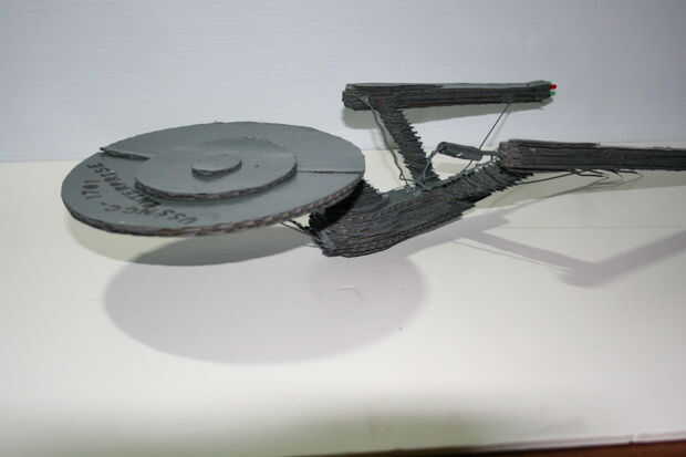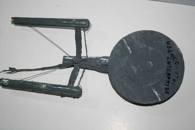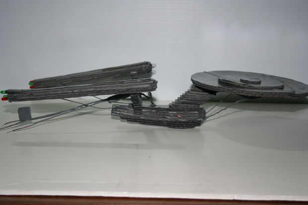 Hice un modelo de cartón de la USS Enterprise de Star Trek con Make 123D. Es accionadas por un arduino de luces parpadeantes. Vea la foto porque una imagen vale 1 mil palabras. Una vez pintado,