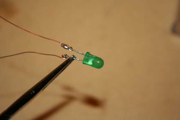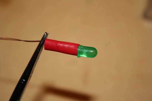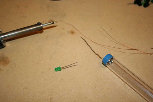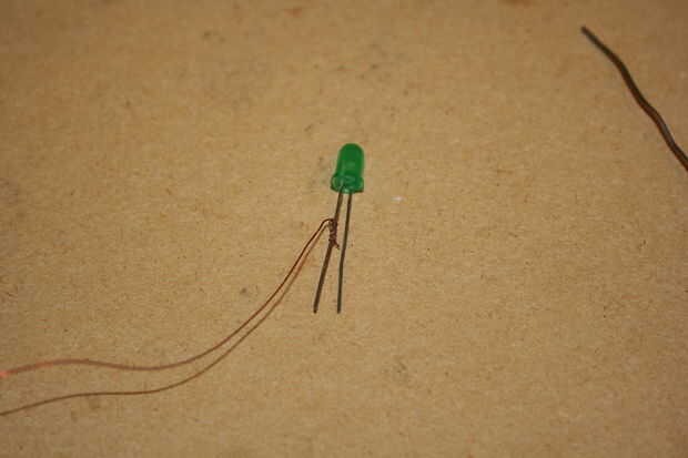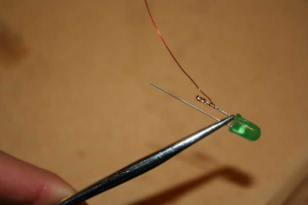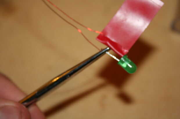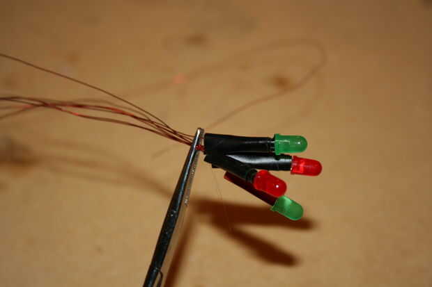 Primero, corte 20 cm 45 piezas de 30 awg alambre del esmalte y dos cm de esmalte cada extremo de la tira. A continuación, envuelva el extremo de una alambre alrededor de la pierna de un LED, luego doblar la pierna por la mitad y soldadura, repita con la otra pierna. Finalmente, cortar un pequeño trozo de cinta aislante y luego doblar la parte de ella sobre una pierna, luego envolver firmemente alrededor de ambas piernas, repita para los otros nueve LEDs.