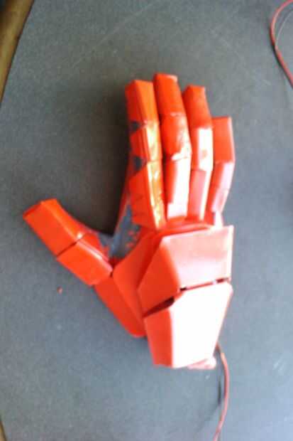 La mano fue construida alrededor de un guante de látex/tela que compré de Lowe. Corte más secciones de plástico de desecho y había pegado a la palma del guante, puntas de los dedos y detrás la mano. Tenga en cuenta que las chapas por la parte trasera no se unen rígido al guante. He doblado unos trozos de plástico de desecho y pegado entre las placas de metal para actuar como una bisagra de resorte. Esto se utilizará para facilitar los interruptores de repulsor blast discutidos más adelante en el Instructable.