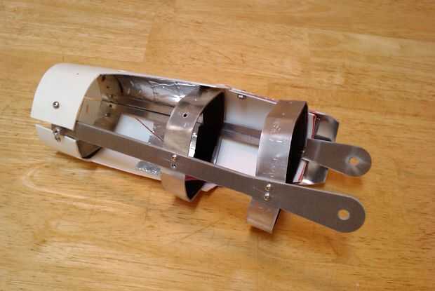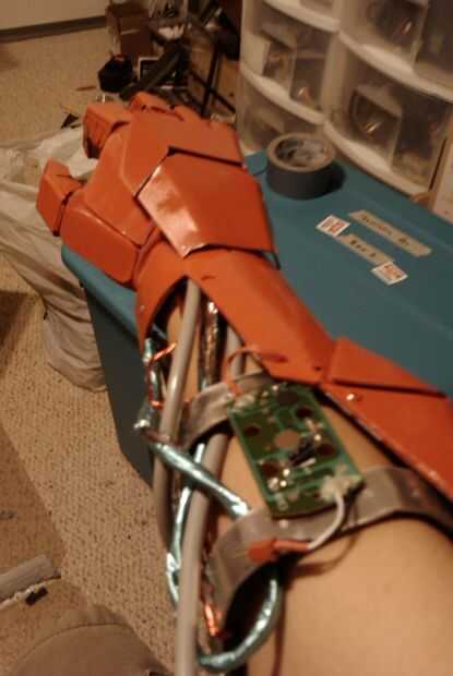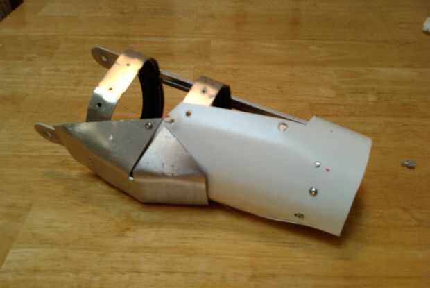 A continuación comencé a paneles de armadura de apernado a la estructura. Terminé usando una pieza de plástico de desecho para cubrir la mayoría del antebrazo porque es más fácil de la máquina y la forma que las placas de metal. También me permitió implementar un sistema de desmontaje rápido y fácil para no tener que estar encerrado en la armadura la parte entera. Quitar un perno permite el marco a partirse por la mitad; Esto me permite meter mi mano del marco en lugar de destornillar todos los tornillos. Una banda de goma de algunos productos se utilizó como un tensor de resorte para mantener los paneles juntos.