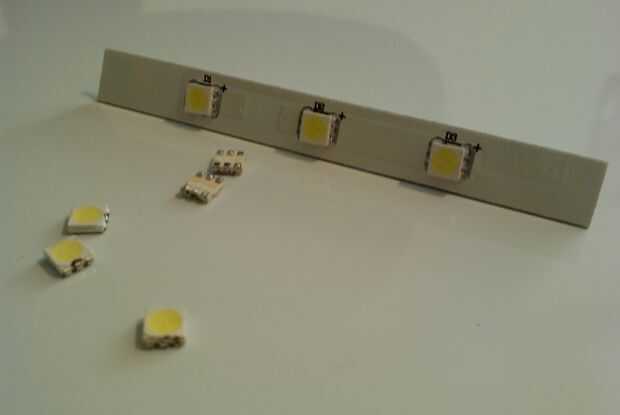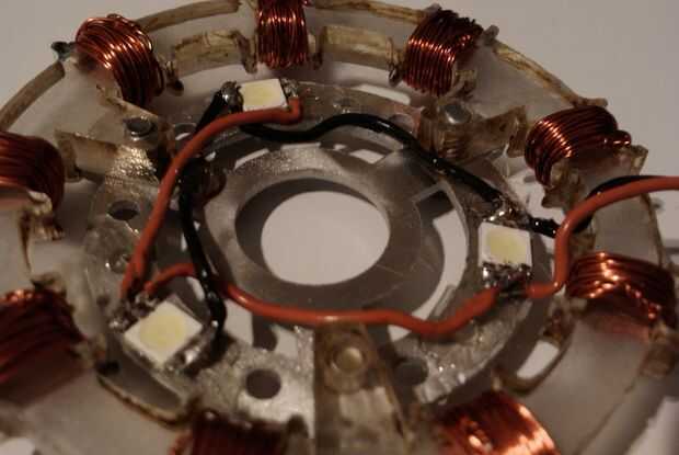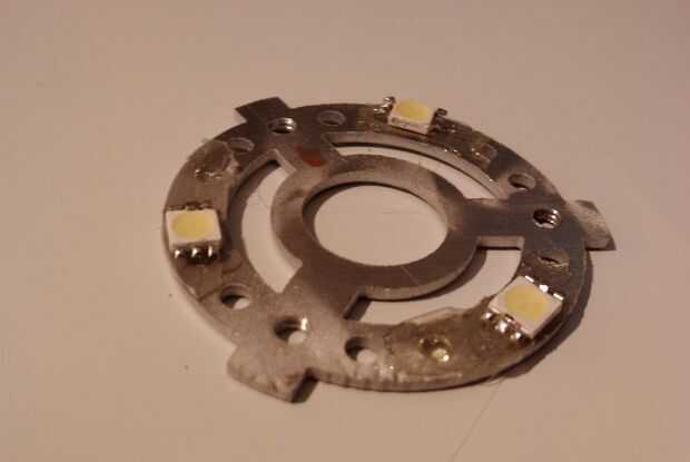 He comprado un montón de placas de LED de mi tienda local de sobra con la intención de apalancándola los LEDs hermoso montaje superficial (SMT). Tuve que quitarlos de los tableros por calentar los terminales positivo y negativo con un soldador y cuidadosamente los curiosos de la Junta Directiva. He decidido utilizar tres LEDs por reactor arc, espaciadas 120 grados apartes.