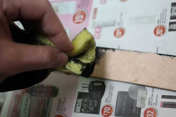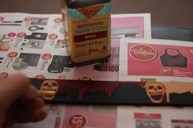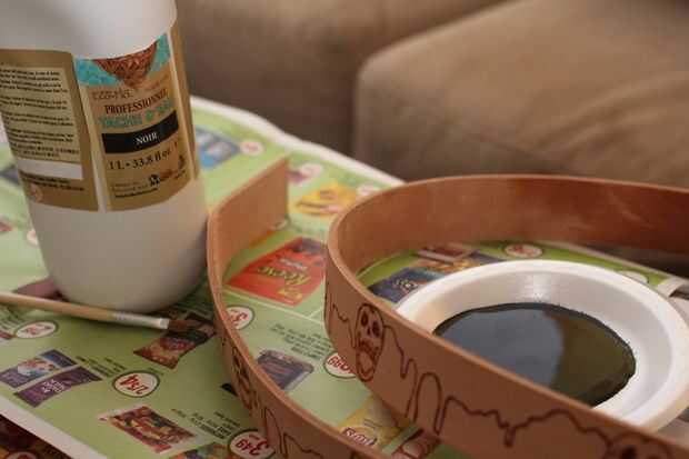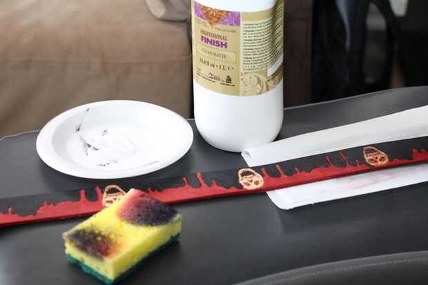 - Una vez el cinturón pintado y completamente seco, agarra su acabado líquido y pasar el cinturón con una esponja. Si le preocupa el color sangría, tenga cuidado, se purga a través de. Pasar ambos lados de la banda, ah y no olvides los bordes en todo esto!