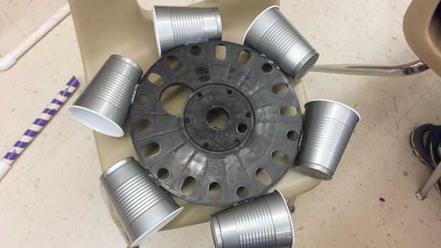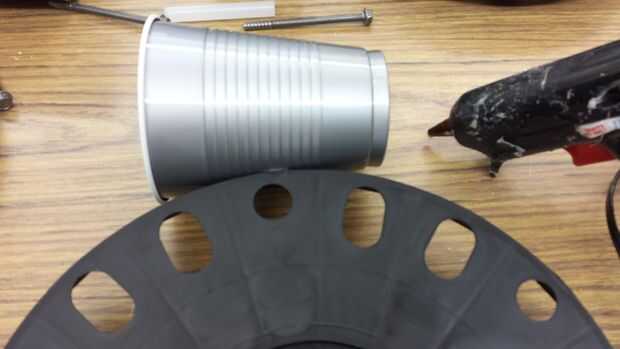 Tome la bobina de la pipa del PVC base. Recoger una pistola de pegamento caliente y pegamento extra, así como algunas tazas. Estratégicamente utilizando el pegamento caliente, pegar las tazas en el carrete para que él puede coger cuando haya terminado de viento.