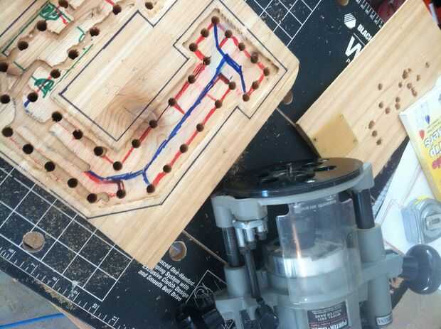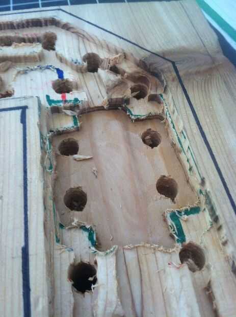 Esto fue prueba y error que todo ajusta bien. He tenido que volver atrás y quitar un poco de material porque los cables no eran bastante bastante tiempo. Necesito quitar algún material todavía en el tablero de perf porque el espacio entre los cables y la placa trasera no es lo suficientemente grueso donde todos los cables vienen juntos. He tenido que quitar el material bajo el tablero de perf para conectar los LEDs debajo.