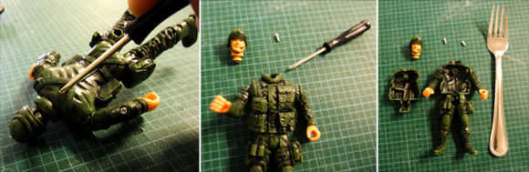 Con el torso abierto, coloque la cabeza de la horquilla en la abertura del cuello del soldado de juguete. Habrá una posición óptima en el escote dependiendo de donde se afina el cuello de la horquilla en el mango. Después de colocada la cabeza de la horquilla, marca mango de la horquilla donde termina el tronco hueco. El mango del tenedor exceso tendrá que eliminarse para caber dentro de la cavidad del torso.