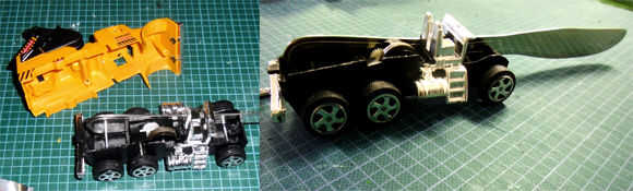 Usando una sierra para metales, corte una hendidura a través del el chasis del carro para sujetar el cuchillo, luego se corta una coincidencia raja en el radiador situado en la mitad superior de la cáscara del carro. Se hicieron varias modificaciones pequeñas en el interior de la carrocería para permitir que el mango del cuchillo para uso bajo y ajustado, una combinación de cuchillo y Sierra para hacer la arboleda en que el cuchillo se sentará.