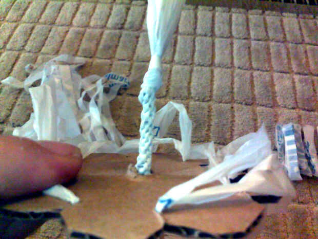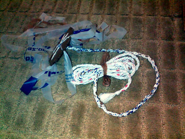 Con este he combinado ambos y había hecha una cable/cuerda muy útil fuera de mero bolsas que iban a la papelera de reciclaje de todos modos. El producto final es bastante útil. Es muy fuerte, es resistente al agua y es prácticamente gratis.