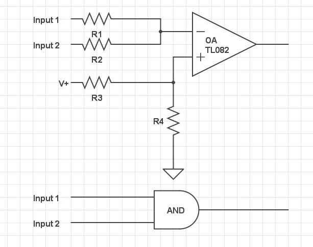 Ambas entradas tendrá que ser valores de lógica (alta o baja) para que funcione correctamente. Si está ejecutando analógicos como los valores a través de este circuito irá alto a 2/3 V + en lugar de V + (debido a la selección de resistencia 4 2 veces el valor de resistencia de 3). Obviamente puede seleccionar resistencias de 3 y 4 para hacerlo más preciso para señales analógicas, pero nunca será perfecto.