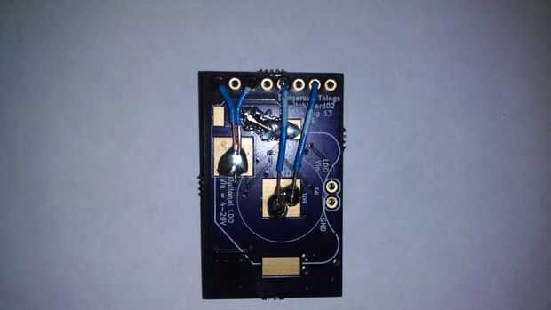 Lo primero que usted querrá hacer es permitir que el poder no regulado a través de-agujeros en el lado de Switcheroo aceptar alimentación 3v del mando a distancia. Para ello, la soldadura de la almohadilla de tensión no regulada para el 3.3v regulador a la almohadilla de clip de batería de 3v.