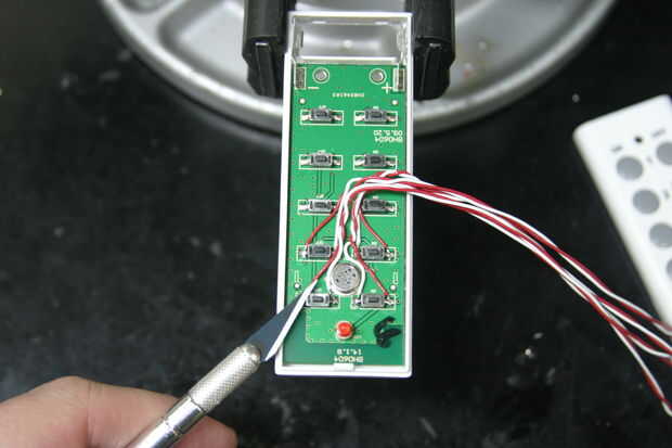 Ahora entrar en la unidad remota y comience el proceso de actualización. Primero retire la puerta de la batería de la parte posterior de la unidad remota y extraiga la batería. Ahora podrá utilizar cuidadosamente el cuchillo de la manía para separar las piezas superior e inferior de la cubierta alejada, exponer la placa de circuito. Una vez abierto, tomar la placa de circuito de control y las piezas de plástico caso apartar.