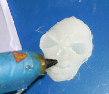 Inspeccionar la superficie del objeto fundido para detectar agujeros o huecos en la superficie que no habían podido ser llenados. Estas podrían ser tratadas, pero tomó un poco de arte a cerrar los orificios y las superficies y características que necesita para construirse. Obviamente, la práctica más uno tiene que trabajar con hotglue, más fácil este tipo de cosa es. Después la hotglue había refrescado, tomé un papel de lija de hobby y corriendo sobre la superficie de la ornamentación del cráneo que incluso, (es decir: hacer el recién agregado pegamento mira al igual que el pegamento fundido.)