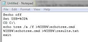 Esta es la pieza clave de información faltaba para las edades. Incluso a este día no estoy muy seguro lo que pasa aquí y si alguien sabe con certeza por qué funciona algo me gustaría saber, pero lo probé y funciona! Esto imprime el código 'árbol /a /f' y guarda en un archivo .cmd, que luego se guarda en la memoria USB como 'echotree.cmd' (Echotree fue lo que decidí llamar al programa).