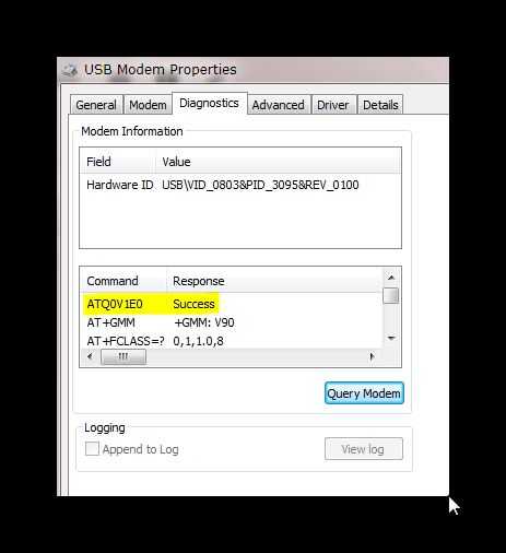 Right Click device and then select Modem Settings>Modems>Properties>Diagnostics>Query Modem