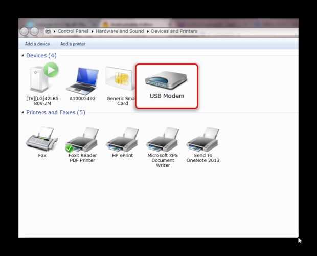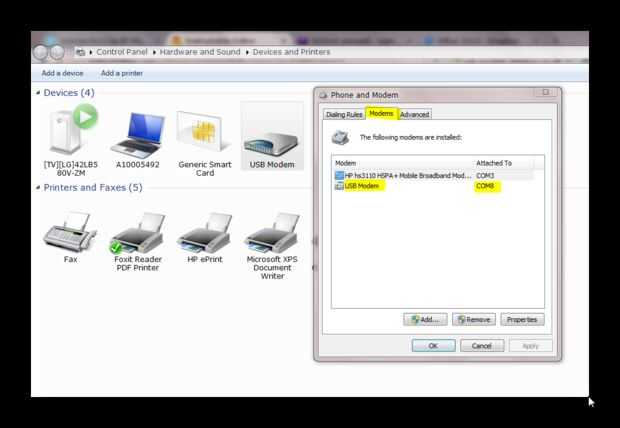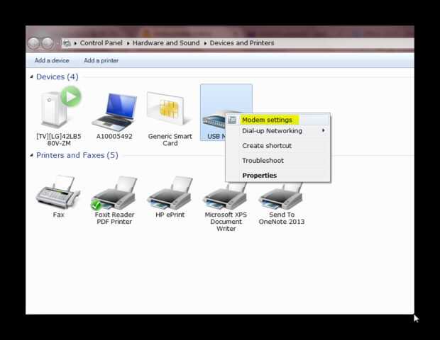 Una vez que ha instalado correctamente el módem, ir a dispositivos e impresoras desde el inicio y asegúrese de que el módem está instalado y muestra como en la imagen de arriba.