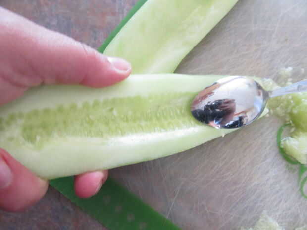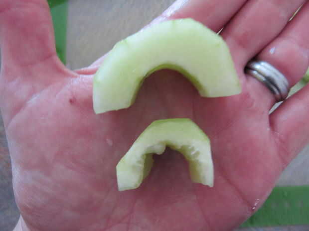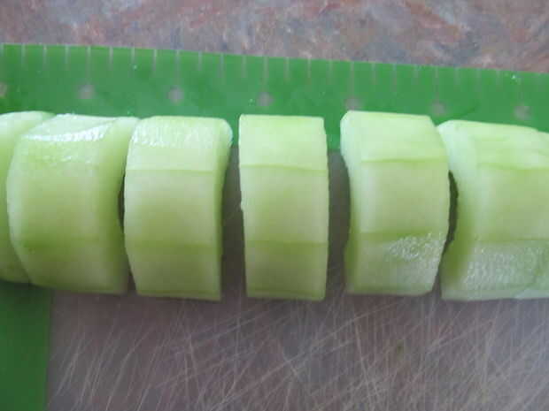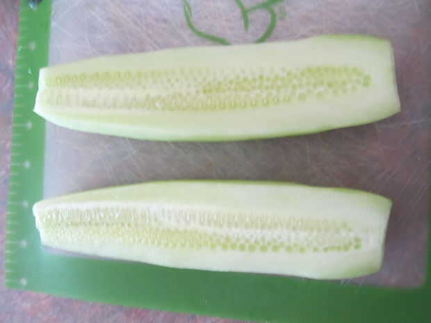 EL TAMAÑO IMPORTA! Se puede ver la importancia de utilizar los pepinos cubiertos para esta receta. Los pepinos demasiado grandes tienen un agradable frontera gruesa de la carne. Un pepino de tamaño regular tiene una frontera más fino y es mucho más pequeño en tamaño. Es importante que las rodajas grandes para que no romperán fácilmente durante el proceso y por lo que son un tamaño de dedo buena comida para comer más adelante. Cuanto más grande mejor!