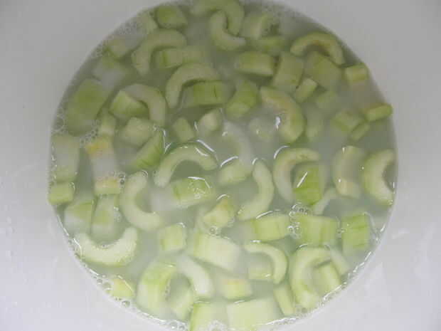 Ahora ponga sus 2 galones digno de rodajas de pepino en el cubo de 5 galones. Mezcle la solución dorada y verter sobre sus sectores. Agregue suficiente agua a la mezcla hasta que sus rebanadas están completamente cubiertos. Ponga la tapa en el cubo y dejar reposar 24 horas.