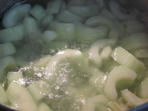 Ahora drenar y enjuague sus encurtidos y luego ponerlos en una olla grande. Una vez más que los cubre con agua. Poner el agua a hervir y luego reducir el calor a fuego lento. Hervir por 2 horas. (agregar más agua según sea necesario para mantener los encurtidos cubiertos)