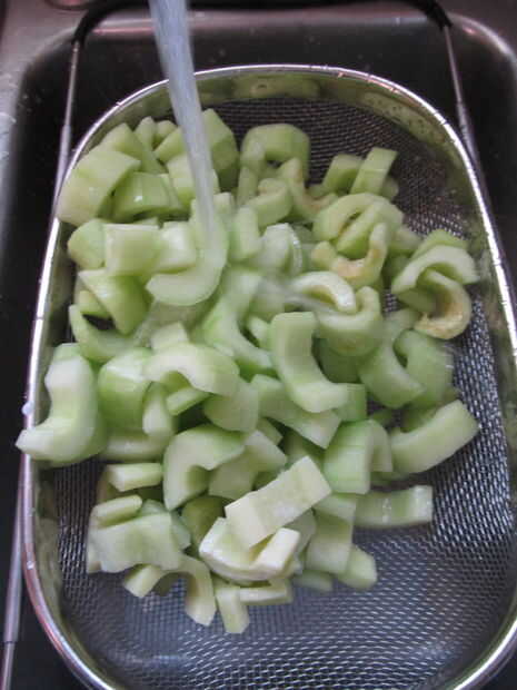 A continuación, drenaje y enjuagar nuevamente y volcarlos en su cubo. Esta vez será preparar el jarabe de caramelo para cubrirlos con.