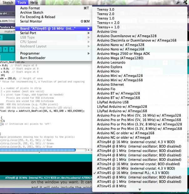 Abra el archivo de Boards.txt potenciales que vienen con su archivo ATTiny. Tendremos que copiar las configuraciones que deseamos utilizar en Arduino. Los que necesitamos son para ATTiny85, específicamente ATTiny85 a 16 MHz (PLL interno; 4,3 V BOD) pero sentir Bienvenido a añadir otros si crees que van a ser útiles.