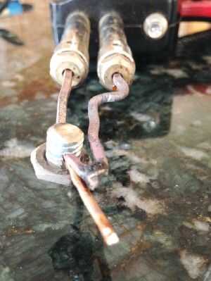 Quiero poner un punto de cobre fino hecho de alambre eléctrico #12 hasta la punta de mi pistola de soldar de 100/140 vatios. La foto muestra lo que hice. Hice una fractura del perno para sujetar el alambre firmemente cerca de la punta de la pistola de soldar.