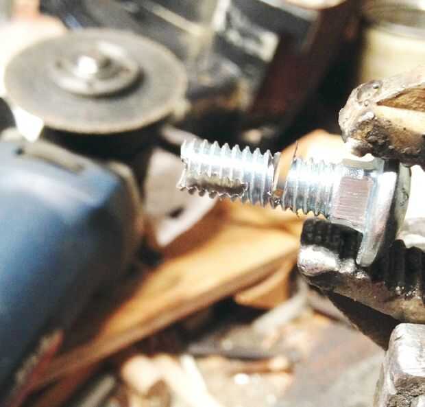 Quiero mantener la cantidad de metal en el perno de la fractura al mínimo así más calor va a la punta del cable y menos calor se utiliza para calentar el perno split. Cortar el tornillo. Observe el corte de la superficie superior del perno un poco a la derecha de la ranura por la mitad del perno. Alise los bordes ásperos.