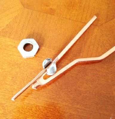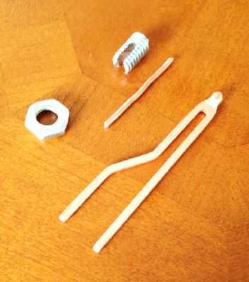 La primera foto muestra las piezas (split perno tuerca más delgado y alambre de cobre) con un nuevo cabezal de pistola. La segunda foto muestra cómo encajan las piezas. Utilice un par de alicates para apretar la tuerca en el perno de la fractura. El alambre de cobre será lo suficientemente seguro para calentar para arriba cuando la pistola está en uso, pero no será casi tan caliente como una pistola de soldadura de 100 vatios.