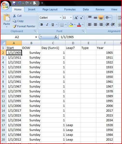 Mover el cursor a la celda A2. Seleccione ordenar y filtrar, luego tipo de costumbre. ¿Ordenar por el día (el sol = 1) y salto? columnas. Haga clic en Aceptar. Los datos se ordenarán para todo el tipo 1 (la semana comienza en domingo, no un año bisiesto) están juntos, etcétera.