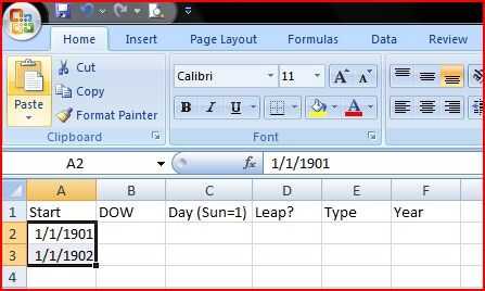 En la celda A3, introduzca la fecha 01/01/1902. Mantenga pulsado el ratón izquierdo y seleccionar las celdas A2 y A3. Usted notará que en la esquina inferior derecha de la selección es una pequeña caja negra; manteniendo pulsado el botón izquierdo del ratón, seleccione la pequeña caja negra y arrastrar hacia abajo (cuando el ratón se cierne sobre el lugar correcto, se convertirá en un signo 'más'). Al arrastrar hacia abajo, usted notará que una fecha se mostrará. Arrastre hacia abajo hasta llegar a 01/01/2036 y suelte el botón izquierdo del ratón. Cuando voy a ser capaz de retirarse, dado el mercado actual!